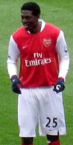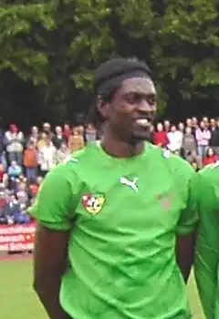 Sheyi Emmanuel Adebayor ⓘ(French pronunciation: [ɛmanɥɛl adəbɛjɔʁ]; born 26 February 1984) is a Togolese former professional footballer who played as a striker. During his career, he played for English clubs Arsenal, Manchester City, Tottenham Hotspur and Crystal Palace, as well as French side Metz, Monégasque team Monaco, Spanish team Real Madrid, Turkish clubs İstanbul Başakşehir and Kayserispor, Paraguay's Club Olimpia and Togolese club Semassi.