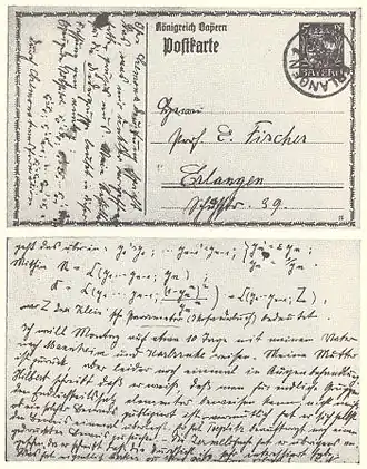 Gordan retired in 1910,[38] and Noether taught under his successors, Erhard Schmidt and Ernst Fischer, who took over from the former in 1911.[39] According to her colleague Hermann Weyl and her biographer Auguste Dick, Fischer was an important influence on Noether, in particular by introducing her to the work of David Hilbert.[40][41] Noether and Fischer shared lively enjoyment of mathematics and would often discuss lectures long after they were over; Noether is known to have sent postcards to Fischer continuing her train of mathematical thoughts.[42][43]