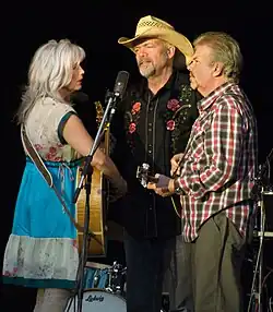 Harris received further exposure to country music and developed an appreciation for it through her collaborations with Gram Parsons.[114] She told The Columbus Dispatch that she had not taken the genre seriously up to that point because she did not see the artistry of it.[123] Parsons exposed Harris to the music of the Louvin Brothers, Bill Monroe and George Jones. Their songs became a significant influence on her. "These were deep, emotionally troubling songs, but he opened my ears to the beauty of it, the simplicity of the poetry," she explained.[124] Harris hired Rodney Crowell to join her band when she became a solo act. His traditional Texan country background[125] was said by Harris to influence her country music artistry. "I think that his presence in the early part of my career, first as a songwriter and then as a member of the band and then as kind of my soul brother, musically, was really important to getting my footing as a performing artist," Harris commented.[126]