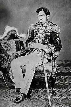 In a brief ceremony in Kyoto, the crown prince formally ascended to the throne on 13 February 1867.[33] The new emperor continued his classical education, which did not include matters of politics. In the meantime, the shōgun, Yoshinobu, struggled to maintain power. He repeatedly asked for the emperor's confirmation of his actions, which he eventually received, but there is no indication that the young emperor was himself involved in the decisions. The shishi and other rebels continued to shape their vision of the new Japan, and although they revered the emperor, they had no thought of having him play an active part in the political process.[34]