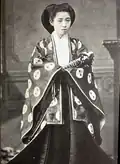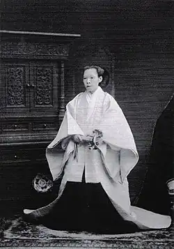 Prince Mutsuhito was born on 3 November 1852 in a small house on his maternal grandfather's property at the north end of the Gosho. At the time, birth was culturally believed to be a source of pollution, so the imperial prince was not born in the Palace. Instead, it was common for members of the Imperial Family to be born in a structure, often temporary, near the pregnant woman's father's house. The Prince Mutsuhito's mother, Nakayama Yoshiko, was a concubine (Japanese: 権の典侍, romanizedgon no tenji) to his father Emperor Kōmei, and she was the daughter of the acting major counselor, Nakayama Tadayasu.[14] The young prince was given the title Sachi-no-miya, or Prince Sachi.[15]