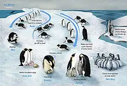 Although emperor penguins can breed at around three years of age, they generally do not begin breeding for another one to three years.[19] The yearly reproductive cycle begins at the start of the Antarctic winter, in March and April, when all mature emperor penguins travel to colonial nesting areas, often walking 50 to 120 km (31 to 75 mi) inland from the edge of the pack ice.[71] The start of travel appears to be triggered by decreasing day lengths; emperor penguins in captivity have been induced successfully into breeding by using artificial lighting systems mimicking seasonal Antarctic day lengths.[72] The British Antarctic Survey used satellite imagery to find new emperor penguin breeding sites in Antarctica, a discovery that increased the estimated population of the emperor penguins by 5 to 10 percent to around 278,000 breeding pairs. Given their remote locations and harsh weather conditions, penguin populations are found by scanning aerial imagery and locating enormous pages of ice that have been stained with their guano. The new discoveries increased the number of known breeding sites from 50 to 61.[73]
