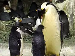 Today the species, considered a flagship species, is kept at just a few zoos and public aquariums in North America and Asia. Emperor penguins were first successfully bred at SeaWorld San Diego; more than 20 birds have hatched there since 1980.[94][95] Fifty-five individuals were counted in captivity in North American zoos and aquaria in 1999.[96] In China, the emperor penguin was first bred at Nanjing Underwater World in 2009,[97] followed by Laohutan Ocean Park in Dalian in 2010.[98] Since then it has been kept and bred at a few other facilities in China, and the only confirmed twin emperor penguins (the species normally lays just one egg) hatched at Sun Asia Ocean World in Dalian in 2017.[99] In Japan, the species is housed at the Port of Nagoya Public Aquarium and Wakayama Adventure World, with successful hatching at Adventure World.[100]