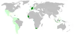 All areas of the world that were once part of the Portuguese Empire. The Portuguese established in the early 16th century together with the Spanish Empire the first global empire and trade network.[132]