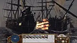 Individual ships can be manoeuvred, or remain in formation with other ships from the fleet. Players can designate which parts of a hostile ship they want a crew to target, making ships prone to sustaining authentic damage during a battle: masts can be toppled, sails and gun ports can be destroyed and damage can entirely disable a ship's ability to manoeuvre or eventually sink it.[8] The types of ammunition that can be used during a battle are grapeshot, chain-shot and round shot, which have different uses, from killing enemy crew to disabling enemy movement. As battles progress, crews can try to board enemy vessels and fight hand-to-hand in an attempt to capture the ship.[17] The weather in a naval battle is also important; bad weather can create poor visibility.[17] Ships cannot be repaired in mid-battle, unlike its successor, Napoleon: Total War, but fires on board ships can be put out automatically.