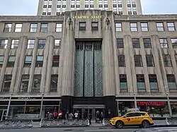 The original main lobby is accessed from Fifth Avenue, on the building's east side, and is the only place in the building where the design contains narrative motifs.[55] It contains an entrance with one set of double doors between a pair of revolving doors. At the top of each doorway is a bronze motif depicting one of three "crafts or industries" used in the building's construction—Electricity, Masonry, and Heating.[86] The three-story-high space runs parallel to 33rd and 34th Streets.[87] The lobby contains two tiers of marble: a wainscoting of darker marble, topped by lighter marble. There is a pattern of zigzagging terrazzo tiles on the lobby floor, which leads from east to west.[87] To the north and south are storefronts, which are flanked by tubes of dark rounded marble and topped by a vertical band of grooves set into the marble.[87] Until the 1960s, there was a Longchamps restaurant next to the lobby, with six oval murals designed by Winold Reiss; these murals were placed in storage when the Longchamps closed.[88][89]