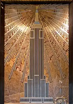 The western ends of the north and south walls include escalators to a mezzanine level.[87][e] At the west end of the lobby, behind the security desk, is an aluminum relief of the skyscraper as it was originally built (without the antenna).[90] The relief, which was intended to provide a welcoming effect,[14] contains an embossed outline of the building, with rays radiating from the spire and the sun behind it.[91] In the background is a state map of New York with the building's location marked by a "medallion" in the very southeast portion of the outline. A compass is depicted in the bottom right and a plaque to the building's major developers is on the bottom left.[92][91] A scale model of the building was also placed south of the security desk.[92]