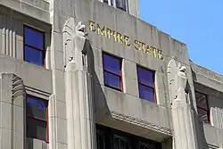 The main entrance, composed of three sets of metal doors, is at the center of the facade's Fifth Avenue elevation, flanked by molded piers that are topped with eagles. Above the main entrance is a transom, a triple-height transom window with geometric patterns, and the golden letters "Empire State" above the fifth-floor windows.[56][38][57] There are two entrances each on 33rd and 34th streets, with modernistic, stainless steel canopies projecting from the entrances on 33rd and 34th streets there. Above the secondary entrances are triple windows, less elaborate in design than those on Fifth Avenue.[30][38][57]