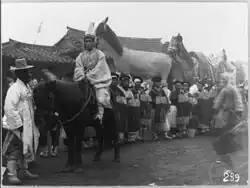 This possible bride underwent a strict selection process, culminating in a meeting with the Daewongun on 6 March, and a marriage ceremony on 20 March 1866.[20] The Daewongun, likely fearing that the Andong Kim clan and the Pyungyang Jo clan, who were political rivalries for the future, may have been influenced favourably towards Lady Min due to her lack of a father or brother. He did not suspect Lady Min herself as politically ambitious, and he was satisfied with the interview.[21] It was only later he observed that she "...was a woman of great determination and poise“ but that he nevertheless allowed her to marry his son.[22] In doing so, he raised to the throne a woman who by 1895 had proven herself to be "his chief foil and implacable enemy."[23]