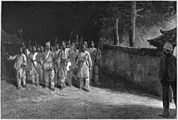 In the 1880s and 1890s the relationship between Joseon and neighbouring Japan deteriorated. The queen consort was considered an obstacle by the government of Meiji Japan to its overseas expansion.[3] She took a firmer stand against Japanese influence after Daewongun's failed rebellions that were intended to remove her from the political arena.[4] Miura Gorō, Japanese Minister to Korea, backed the faction headed by Daewongun and directly ordered her assassination. On 8 October 1895, the Hullyeondae Regiment loyal to the Daewongun attacked the Gyeongbokgung Palace and overpowered its Royal Guards. The intruders then allowed a group of ronin, specifically recruited for this purpose, to assassinate the queen consort. Her assassination sparked international outrage.[5]