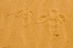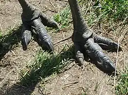 Although flightless, emus have vestigial wings, the wing chord measuring around 20 cm (8 in), and each wing having a small claw at the tip.[33] Emus flap their wings when running, perhaps as a means of stabilising themselves when moving fast.[8] They have long necks and legs,[34] and can run at speeds of 48 km/h (30 mph) due to their highly specialised pelvic limb musculature.[33] Their feet have only three toes and a similarly reduced number of bones and associated foot muscles; emus are unique among birds in that their gastrocnemius muscles in the back of the lower legs have four bellies instead of the usual three. The pelvic limb muscles of emus contribute a similar proportion of the total body mass as do the flight muscles of flying birds.[35] When walking, the emu takes strides of about 100 cm (3.3 ft), but at full gallop, a stride can be as long as 275 cm (9 ft).[36] Its legs are devoid of feathers and underneath its feet are thick, cushioned pads.[36] Like the cassowary, the emu has sharp claws on its toes which are its major defensive attribute, and are used in combat to inflict wounds on opponents by kicking.[37] The toe and claw total 15 cm (6 in) in length.[36] The bill is quite small, measuring 5.6 to 6.7 cm (2.2 to 2.6 in), and is soft, being adapted for grazing.[33] Emus have good eyesight and hearing, which allows them to detect threats at some distance.[38]