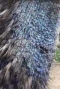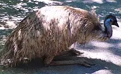The neck of the emu is pale blue and shows through its sparse feathers.[33] They have grey-brown plumage of shaggy appearance;[7] the shafts and the tips of the feathers are black. Solar radiation is absorbed by the tips, and the inner plumage insulates the skin.[39] This prevents the birds from overheating, allowing them to be active during the heat of the day.[40] A unique feature of the emu feather is the double rachis emerging from a single shaft. Both of the rachis have the same length, and the texture is variable; the area near the skin is rather furry, but the more distant ends resemble grass.[8] The sexes are similar in appearance,[41] although the male's penis can become visible when he urinates and defecates.[42] The plumage varies in colour due to environmental factors, giving the bird a natural camouflage. Feathers of emus in more arid areas with red soils have a rufous tint while birds residing in damp conditions are generally darker in hue.[34] The juvenile plumage develops at about three months and is blackish finely barred with brown, with the head and neck being especially dark. The facial feathers gradually thin to expose the bluish skin. The adult plumage has developed by about fifteen months.[30]