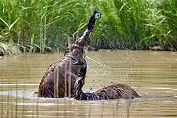 The male becomes broody after his mate starts laying, and may begin to incubate the eggs before the clutch is complete. From this time on, he does not eat, drink, or defecate, and stands only to turn the eggs, which he does about ten times a day.[64] He develops a brood patch, a bare area of wrinkled skin which is in intimate contact with the eggs.[65] Over the course of the eight-week incubation period, he will lose a third of his weight and will survive on stored body fat and on any morning dew that he can reach from the nest. As with many other Australian birds, such as the superb fairywren, infidelity is the norm for emus, despite the initial pair bond: once the male starts brooding, the female usually wanders off, and may mate with other males and lay in multiple nests; thus, as many as half the chicks in a brood may not be fathered by the incubating male, or even by either parent, as emus also exhibit brood parasitism.[66]