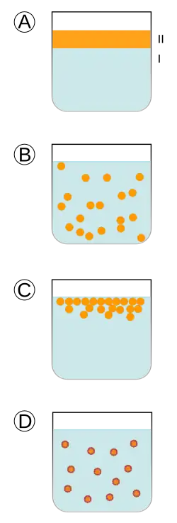 - The surfactant (outline around particles) positions itself on the interfaces between Phase II and Phase I, stabilizing the emulsion