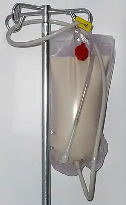 • A patient unable to be fed otherwise can be nourished by an enteral administration of predigested foods, which is known as a nutrient enema.[60] This treatment is ancient, dating back at least to the second century CE when documented by Galen,[61] and commonly used in the Middle Ages,[62] remaining a common technique in 19th century,[63] and as recently as 1941 the U. S. military's manual for hospital diets prescribes their use.[64] Nutrient enemas have been superseded in modern medical care by tube feeding and intravenous feeding.