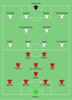 Although Walter Winterbottom was appointed as England's first full-time manager in 1946, the team was still picked by a committee until Alf Ramsey took over in 1963.[15][16] The 1966 World Cup was hosted in England and Ramsey guided England to victory with a 4–2 win against West Germany after extra time in the final, during which Geoff Hurst scored a hat-trick.[17] In UEFA Euro 1968, the team reached the semi-finals for the first time, being eliminated by Yugoslavia.[18]