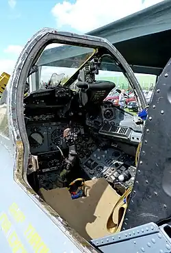The cockpit of the Lightning was designed to meet the RAF's OR946 specification for tactical air navigation technology, and thus featured an integrated flight instrument display arrangement, an Elliott Bros (London) Ltd[66] auto-pilot, a master reference gyroscopic reader, an auto-attack system, and an instrument landing system.[67] Despite initial scepticism of the aircraft's centralised detection and warning system, the system proved its merits during the development program and was redeveloped for greater reliability.[68] Communications included UHF and VHF radios and a datalink.[69] Unlike the previous generation of aircraft which used gaseous oxygen for lifesupport, the Lightning employed liquid oxygen-based apparatus for the pilot; cockpit pressurisation and conditioning was maintained through tappings from the engine compressors.[70]