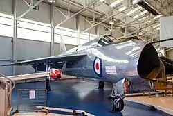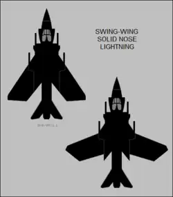 In 1963, BAC Warton was working on the preliminary design of a two-seat Lightning development with a variable-geometry wing, based on the Lightning T.5. In addition to the variable-sweep wing, which was to sweepback between 25 degrees and 60 degrees, the proposed design featured an extended ventral pack for greater fuel capacity, an enlarged dorsal fin fairing, an arrestor hook, and a revised inward-retracting undercarriage. The aircraft was designed to be compatible with the Royal Navy's existing aircraft carriers' carrier-based aircraft, the VG Lightning concept was revised into a land-based interceptor intended for the RAF the following year.[51] Various alternative engines to the Avon were suggested, such as the newer Rolls-Royce Spey engine. It is likely that the VG Lightning would have adopted a solid nose (by moving the air inlet to the sides or to upper fuselage) to install a larger, more capable radar.[52]