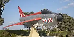 In addition to its training and operational roles, 74 Squadron was appointed as the official Fighter Command aerobatic team for 1961, flying at air shows throughout the United Kingdom and Europe.[103] Deliveries of the slightly improved Lightning F.1A, with improved avionics and provision for an air-to-air refuelling probe, allowed two more squadrons, 56 and 111 Squadron, both based at RAF Wattisham in Suffolk to convert to the Lightning in 1960–1961.[98] The Lightning F.1 would only be ordered in limited numbers and serve for a short time; nonetheless, it was viewed as a significant step forward in Britain's air defence capabilities. Following their replacement from frontline duties by the introduction of successively improved variants of the Lightning, the remaining F.1 aircraft were employed by the Lightning Conversion Squadron.[104]