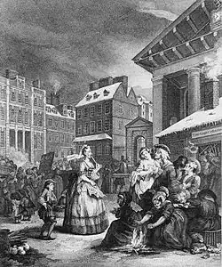 English cuisine in the twentieth century suffered from a poor international reputation. Keith Arscott of Chawton House Library comments that "at one time people didn't think the English knew how to cook and yet these [eighteenth and nineteenth century] female writers were at the forefront of modern-day cooking."[142] English food was popularly supposed to be bland, but English cuisine has made extensive use of spices since the Middle Ages, introduced curry to Europe, and makes use of strong flavourings such as English mustard. It was similarly reputed to be dull, like roast beef, but that dish was highly prized both in Britain and abroad, and few people could afford it; the "Roast Beef of Old England" lauded by William Hogarth in his 1748 painting celebrated the high quality of English cattle, which the French at the "Gate of Calais" (the other name of his painting) could only look at with envy. The years of wartime shortages and rationing certainly did impair the variety and flavour of English food during the twentieth century, but the nation's cooking recovered from this with increasing prosperity and the availability of new ingredients from soon after the Second World War.[143]