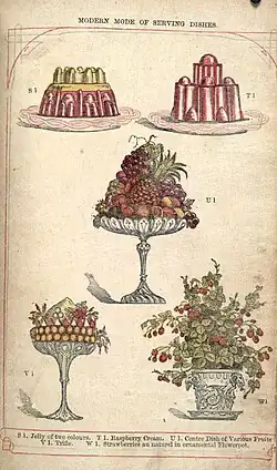 Acton was supplanted by the most famous English cookery book of the Victorian era, Isabella Beeton's Mrs Beeton's Book of Household Management, 1861, which sold nearly two million copies up to 1868.[30] Where Acton's was a book to be read and enjoyed, Beeton's, substantially written in later editions by other hands, was a manual of instructions and recipes, to be looked up as needed.[31] Mrs Beeton was substantially plagiarised from authors including Elizabeth Raffald and Acton.[32] The Anglo-Italian cook Charles Elmé Francatelli became a celebrity, cooking for a series of aristocrats, London clubs, and royalty including Queen Victoria. His 1846 book The Modern Cook ran through 29 editions by 1896, popularising an elaborate cuisine described throughout with French terminology, and offering bills of fare for up to 300 people.[33][34]