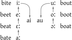 Illustration of the Great Vowel Shift that affected long vowels in Early Modern English. After the highest vowels /i: u:/ broke into diphthongs /ai au/, each of the lower vowels gradually shifted up one level to compensate.