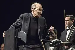His filmography includes more than 70 award-winning films, all of Sergio Leone's films from A Fistful of Dollars on, all of Giuseppe Tornatore's films since Cinema Paradiso, Dario Argento's Animal Trilogy, as well as The Battle of Algiers (1966), 1900 (1976), La Cage aux Folles (1978), Le Professionnel (1981), The Thing (1982), The Key (1983) by Tinto Brass and Tie Me Up! Tie Me Down! (1989). He received the Academy Award for Best Original Score nominations for Days of Heaven (1978), The Mission (1986), The Untouchables (1987), Bugsy (1991), Malèna (2000) and The Hateful Eight (2015), winning for the last.[4] He won the Academy Honorary Award in 2007.[5] His score to The Good, the Bad and the Ugly (1966) is regarded as one of the most recognizable soundtracks in history.[6] It was inducted into the Grammy Hall of Fame in 2008.[7]
