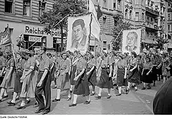At the end of 1944, Berlinguer was appointed by Togliatti to the national secretariat of the Italian Communist Youth Federation (FGCI). As a secretary of the FGCI, Berlinguer at one point presented Maria Goretti as an example for activists.[38] Berlinguer was soon sent to Milan, and he was appointed to the central committee as a member in 1945. In 1946, Togliatti became the national secretary (the highest political position) of the PCI and called Berlinguer to Rome, where his talents let him enter the national leadership two years later in 1948; at the age of 26, he was one of the youngest members to be admitted. In 1949, he was named national secretary of the FGCI, a post he held until 1956. In 1950, he became president of the World Federation of Democratic Youth, an international anti-fascist youth organisation.[39]