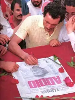 Berlinguer's search for a new socialism was to find a solution to the bipolar international blocs, and his name is thus associated to that of Willy Brandt and Olof Palme.[95] In October 2012, Nichi Vendola said of his alternative Europeanism that "the one that we continue to dream is not the unbalanced power that rules today, with an unknown identity. No: it is the Europe of Willy Brandt, of Olof Palme, of Enrico Berlinguer."[96] Within the broad international Communist movement, Berlinguer had many opponents. The more orthodox Marxist–Leninist opposition argued that he had turned a workers' party into a bourgeois, revisionist one. External opponents said that the strappo, the break with the CPSU, took several years to be completed; this was seen as evidence that there had been no definitive decision on the point. The acceptance of NATO is generally seen as evidence of the genuine autonomy of the PCI's position, and Berlinguer was seen in declassified CIA documents as the strongest critic of Soviet actions, such as their role in suppressing the Prague Spring of 1968, which was a turning point.[41] Despite notably successful Communist local governments, Berlinguer's efforts failed to bring the PCI into government. His final platform, "The Democratic Alternative", was never realised. Within a decade of his death, the Soviet Union and the DC and PCI parties all disappeared, leading to the Second Italian Republic and transforming Italian politics beyond recognition.[37] For some, for the vast population on the political left, which felt dispersed, his death marked the end of the PCI. On his death, not only the head of the largest Communist party in the West died but also an idea to which millions of Italians had dedicated a good part of their existence during the 20th century, what Francesco Guccini called "the timeless dreams".[86]