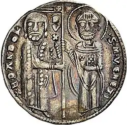 In 1194, Dandolo enacted important reforms to the Venetian currency system. Before these reforms, Venice's principal coin was the silver penny, which weighed less than a gram and was about one-quarter fine.[25] Due to the debasement of the silver penny in 1180 and the constant fluctuation in value of Jerusalem and Byzantine coins,[26] Dandolo instated three denominations of this silver penny, the bianco (half-penny), the quartarolo (quarter-penny), and the silver grosso.[27] The bianco had a silver content of about five percent, and was decorated with a cross on one side and St. Mark on the other.[28] The quartarolo had almost no precious metal content, which made it the first European token coin since ancient Rome.[28] The grosso was the first nearly pure silver–and high denomination–coin minted in western Europe in over five centuries.[28][29] It was decorated with an image of Dandolo and St. Mark on one side, and of Jesus Christ enthroned on the other side, which imitated a design typically seen on Byzantine aspron trachy coins.[28] The grosso eventually became the dominant coin of Mediterranean commerce.[28]