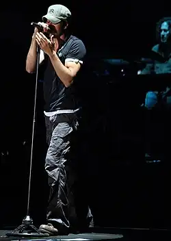 In 2000, Iglesias performed at the Super Bowl XXXIV halftime show with Christina Aguilera, Phil Collins and Toni Braxton.[40] Shock jock Howard Stern repeatedly played a tape of a (supposedly) very off-key Iglesias on his radio show, accusing him of "not being able" to sing live. On 8 June 2000, Iglesias came to New York and sang the song, live and unplugged, on Stern's show with just an accompanying guitarist. After the performance, the two had an interview, and Stern remarked, "I respect you for coming in here; you really can sing."[41] Iglesias noted that the recording could have been him, but that it was probably a recording made during a television taping where he was required to lip sync and not sing properly.[42] He would remark that the controversy was the best promotion he could have. The album's single "Be with You" became Iglesias's second number-one single on Billboard's Hot 100 chart.[38]