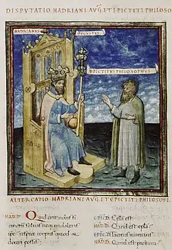 The philosophy of Epictetus influenced the Roman emperor Marcus Aurelius (AD 121 to AD 180), who cites Epictetus in his Meditations.[37] Epictetus also appears in a second or third century Dialogue Between the Emperor Hadrian and Epictetus the Philosopher.[38] This short Latin text consists of seventy-three short questions supposedly posed by Hadrian and answered by Epictetus.[38] This dialogue was very popular in the Middle Ages with many translations and adaptations.[38]