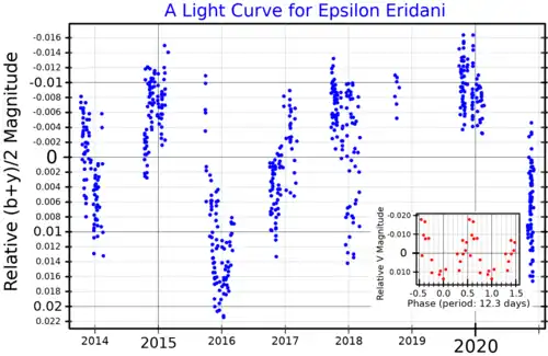 - ^ a b Gray, David F.; Baliunas, Sallie L. (March 1995), "Magnetic activity variations of Epsilon Eridani", The Astrophysical Journal, 441 (1): 436–442, Bibcode:1995ApJ...441..436G, doi:10.1086/175368.