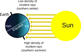 Diagram of the seasons, showing the situation at the December solstice. Regardless of the time of day (i.e. Earth's rotation on its axis), the North Pole will be dark, and the South Pole will be illuminated; see also polar night and polar day. In addition to the density of incident light, the dissipation of light in the atmosphere is greater when it falls at a shallow angle. Note that the equator is not under the subsolar point during this time of year.