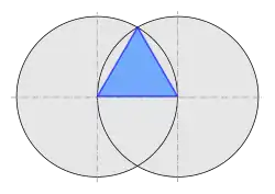 The very first proposition in the Elements by Euclid starts by drawing a circle with a certain radius, placing the point of the compass on the circle, and drawing another circle with the same radius; the two circles intersect in two points. An equilateral triangle can be constructed by joining the two centers of the circles and one of the points of intersection.[18]