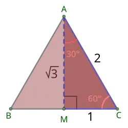 The area of an equilateral triangle with edge length is The formula may be derived from the formula of an isosceles triangle by Pythagoras theorem: the altitude of a triangle is the square root of the difference of squares of a side and half of a base.[3] Since the base and the legs are equal, the height is:[7] In general, the area of a triangle is half the product of its base and height. The formula for the area of an equilateral triangle can be obtained by substituting the altitude formula.[7] Another way to prove the area of an equilateral triangle is by using the trigonometric function. The area of a triangle is formulated as the half product of base and height and the sine of an angle. Because all of the angles of an equilateral triangle are 60°, the formula is as desired.