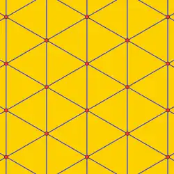 Notably, the equilateral triangle tiles the Euclidean plane with six triangles meeting at a vertex; the dual of this tessellation is the hexagonal tiling. Truncated hexagonal tiling, rhombitrihexagonal tiling, trihexagonal tiling, snub square tiling, and snub hexagonal tiling are all semi-regular tessellations constructed with equilateral triangles.[19] Other two-dimensional objects built from equilateral triangles include the Sierpiński triangle (a fractal shape constructed from an equilateral triangle by subdividing recursively into smaller equilateral triangles) and Reuleaux triangle (a curved triangle with constant width, constructed from an equilateral triangle by rounding each of its sides).[10]
