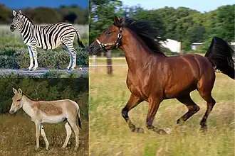 | Clockwise (from top left): plains zebra (E. quagga), domestic horse (E. f. caballus), onager (E. hemionus) | |