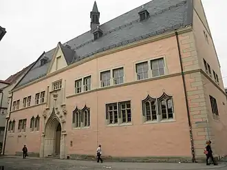 The Jewish community of Erfurt was founded in the 11th century. Together with the Jewish communities in Mainz, Worms and Speyer, it became one of the most influential in Germany. The Old Synagogue is still extant and is a museum today, as is the mikveh at Gera river near Krämerbrücke.[21] In 1349, during the wave of Black Death Jewish persecutions across Europe, the Jews of Erfurt were rounded up, with more than 100 killed and the rest driven from the city. Before the persecution, a wealthy Jewish merchant buried his property in the basement of his house. In 1998, this treasure was found during construction works. The Erfurt Treasure with various gold and silver objects is shown in the exhibition in the synagogue today.[22] Only a few years after 1349, the Jews moved back to Erfurt and founded a second community, which was disbanded by the city council in 1454.[23] Because of their exceptional testimony to the life of a medieval Jewish community, the Jewish sites in Erfurt were inscribed on the UNESCO World Heritage List in 2023.[24]