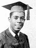 Eric Dolphy was born and raised in Los Angeles, California.[11][12] His parents were Sadie and Eric Dolphy, Sr.,[13] who immigrated to the United States from Panama.[1] He began music lessons at the age of six, studying clarinet and saxophone privately.[14] While still in junior high, he began to study the oboe, aspiring to a professional symphonic career,[14] and received a two-year scholarship to study at the music school of the University of Southern California.[12] When aged 13, he received a "Superior" award on clarinet from the California School Band and Orchestra festival.[14] He attended Dorsey High School, where he continued his musical studies and learned additional instruments.[14] By 1946, he was co-director of the Youth Choir at the Westminster Presbyterian Church run by Reverend Hampton B. Hawes, father of the jazz pianist of the same name.[14] He graduated in 1947, then attended Los Angeles City College, during which time he played contemporary classical works such as Stravinsky's L'Histoire du soldat and, along with Jimmy Knepper and Art Farmer, performed with Roy Porter's 17 Beboppers.[14] He went on to make eight recordings with Porter by 1949.[1] On these early sessions, Dolphy occasionally played baritone saxophone, as well as alto saxophone, flute, and soprano clarinet.