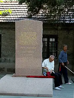 Liddell's first job as a missionary was at the Anglo-Chinese College (grades 1–12) for wealthy Chinese students. The school's principal, Dr. Samuel Lavington Hart, who was educated at the University of Cambridge, had been a prominent physicist before founding the school in 1902. Dr. Hart believed that by teaching the children of the wealthy, he would help them become influential figures in China and promote Christian values.[26] Liddell supported the school's mission and began teaching mathematics and science at the school in 1925.[27] Liddell also used his athletic experience to train boys in a number of different sports. According to one of Liddell's former students, Yu Wenji, Liddell "was very serious when protecting students' rights. He once quarreled with the headmaster to ask for more subsidies for students not from wealthy families."[28] One of Liddell's many responsibilities was that of superintendent of the Sunday school at Union Church, where his father was pastor. Liddell lived at 38 Chongqing Dao (formerly known as Cambridge Road) in Tianjin, where a plaque commemorates his residence. He also helped build the Minyuan Stadium in Tianjin.