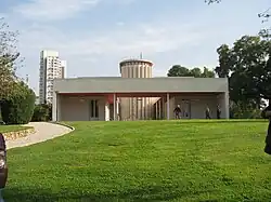 From 1941 until his death, Mendelsohn lived in the United States and taught at the University of California, Berkeley. Until the end of World War II his activities were limited by his immigration status to lectures and publications. However, he also served as an advisor to the U.S. government. For instance, in 1943 he collaborated with the U.S. Army and Standard Oil in order to build "German Village", a set of replicas of typical German working-class housing estates, which would be of key importance in acquiring the know-how and experience necessary to carry out the firebombing of Berlin.[10] In 1945, he established himself in San Francisco. From then until his death in 1953 he undertook various projects, mostly for Jewish communities.