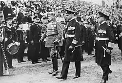 In the winter of 1918–19, Raeder was closely involved in the efforts of the naval officer corps, strongly backed by the Defense Minister Gustav Noske to disband the workers' and soldiers' councils established after the Kiel mutiny.[24] Noske was a Majority Social Democrat with firm "law and order" views. During this period, Raeder served as the liaison between the naval officer corps and Noske, and it was Raeder who suggested to Noske on 11 January 1919 that Adolf von Trotha be appointed commander-in-chief of the Navy.[25] Tirpitz's attacks on the Emperor's leadership during the war had caused a split in the officer corps between the followers of "the Master" and the Kaiser, and Raeder saw Trotha as the only officer acceptable to both factions.[25] Noske in turn asked the Navy for volunteers for the Freikorps to crush uprisings from the Communists.[26] The Navy contributed two brigades to the Freikorps.[27] Under the Weimar Republic, the military considered itself überparteilich (above party), which did not mean political neutrality as implied.[28] The military argued that there were two types of "politics": parteipolitisch (party politics) which was the responsibility of the politicians, and staatspolitisch (state politics) which was the responsibility of the military.[28] Staatspolitisch concerned Germany's "eternal" interests and the "historic mission" of winning world power, which was to be pursued regardless of what the politicians or the people wanted.[28]