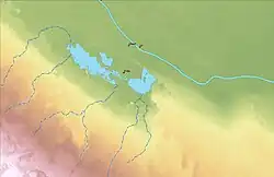 Eridu is located on a natural hill in a basin approximately 15 miles (24 km) long and 20 feet (6.1 m) deep, which is separated from the Euphrates River by a sandstone ridge called the Hazem.[6] This basin, the As Sulaybiyat Depression (formerly: Khor en-Nejeif), becomes a seasonal lake (Arabic: Sebkha) during the rainy season from November to April.[7] During this period, it is filled by the discharge of the Wadi Khanega. Adjacent to eastern edge of the seasonal lake are the Hammar Marshes.