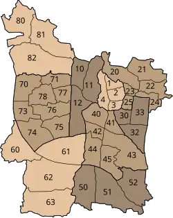 Erlangen officially consists of nine districts and 40 statistical districts, 39 of which are inhabited.[6] In addition, the urban area is subdivided into twelve land registry and land law relevant districts whose boundaries deviate largely from those of the statistical districts. The districts and statistical districts are partly formerly independent municipalities,[7][8] but also include newer settlements the names of which have also been coined as district names. The traditional and subjectively perceived boundaries of neighborhoods often deviate from the official ones.