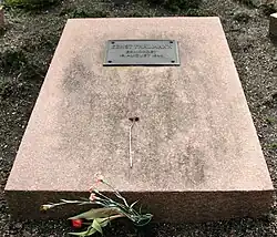 Thälmann spent over eleven years in solitary confinement. In August 1944, he was transferred from Bautzen prison to Buchenwald concentration camp. That month, Heinrich Himmler took notes during a conversation with Hitler saying: "Thälmann must be executed."[21] A fellow Buchenwald prisoner, Marian Zgoda, recalls hearing the shooting of Thälmann on the 18th—four days after Himmler's curt annotation.[22] After he was shot on Hitler's personal order,[23][21] his body was immediately cremated.[5] Shortly after, the Nazis announced that Thälmann had died in an Allied bombing raid on 23 August, together with Rudolf Breitscheid.[24]