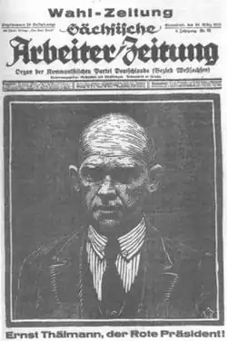 Thälmann's KPD thus fought the SPD as one of their main political enemy, seeing it as a Bourgeoisie party, acting according to the Comintern policy, which declared social democrats to be "social fascists". This made it difficult for the two leftist parties to work together against the emergence of Adolf Hitler.[10] The KPD under Thälmann declared that "fighting fascism means fighting the SPD just as much as it means fighting Hitler and the parties of Brüning."[13] Thälmann declared in December 1931 that "some Nazi trees must not be allowed to overshadow a forest" of social democrats.[14][15]