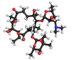 - ^ Kibwage IO, Hoogmartens J, Roets E, Vanderhaeghe H, Verbist L, Dubost M, et al. (November 1985). "Antibacterial activities of erythromycins A, B, C, and D and some of their derivatives". Antimicrobial Agents and Chemotherapy. 28 (5): 630–3. doi:10.1128/aac.28.5.630. PMC 176346. PMID 4091529.