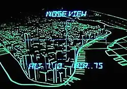 Carpenter was interested in creating two distinct looks for the movie. "One is the police state, high tech, lots of neon, a United States dominated by underground computers. That was easy to shoot compared to the Manhattan Island prison sequences, which had few lights, mainly torch lights, like feudal England".[23] Certain matte paintings were rendered by James Cameron, who was at the time a special-effects artist with Roger Corman's New World Pictures. Cameron was also one of the directors of photography on the film. As Snake pilots the glider into the city, three screens on his control panel display wireframe animations of the landing target on the World Trade Center and surrounding buildings. Carpenter initially wanted high-tech computer graphics, which were very expensive, even for such a simple animation. The effects crew filmed the miniature model set of New York City they used for other scenes under black light, with reflective tape placed along every edge of the model buildings. Only the tape is visible and appears to be a three-dimensional wireframe animation.[24][25]