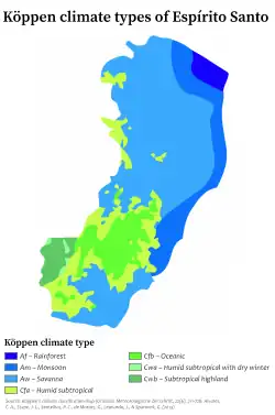 Espírito Santo's climate is tropical along the coast, with dry winters and rainy summers. North of Doce River is generally drier and also hot. In the mountainous regions in the south and southwest of the state, the tropical climate is strongly influenced by altitude, and the average temperatures are lower.